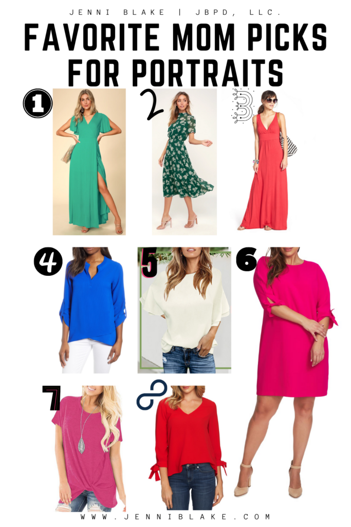 I know you’re thinking that these are mostly solid color options and yes, you’re right. I tend to stick with solid colors for portraits because when you start mixing patterns – especially busy and tight/small patterns – I have to watch putting these people right next to each other in the frame. I want to notice your face and not the patterns clashing. But please note this is only MY preference and not a right or wrong way to dress for portraits.