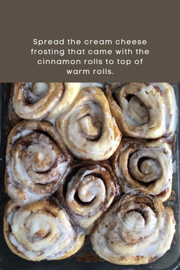 Spread the cream cheese frosting that came with the cinnamon rolls to top of warm rolls. Serve.