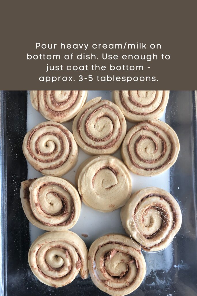 Pour heavy cream/milk on bottom of dish. Use enough to just coat the bottom – approx. 3-5 tablespoons.