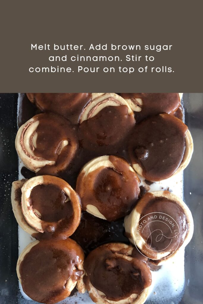 Melt butter. Add brown sugar and cinnamon. Stir to combine. Pour on top of rolls.